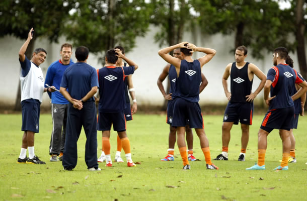 Flávio Araújo conversa com jogadores antes do treino