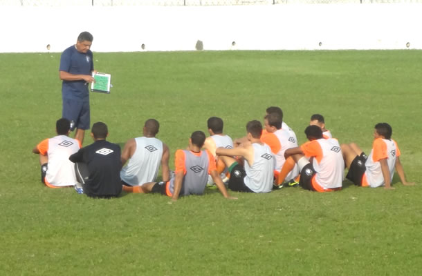 Flávio Araújo conversa com jogadores antes do treino
