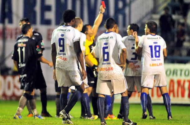 Depois de cerca de oito minutos de paralisação, o juiz autorizou o recomeço do jogo, mas a confusão não parou. O lateral Walber, que estava há um pouco mais de cinco minutos em campo, deu um carrinho no goleiro Leandro e juiz não pensou duas vezes ao mandá-lo para o chuveiro mais cedo. Sorte que Zé Antônio já havia feito o belo gol para salvar a partida e a vitória azulina.
