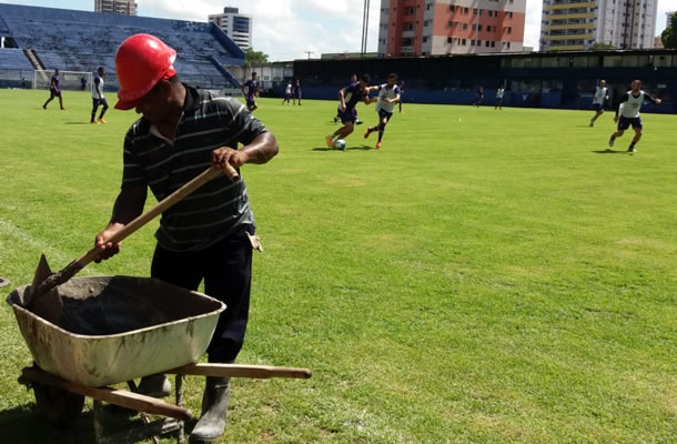 Enquanto jogadores treinam, funcionários trabalham do lado de fora do gramado para deixar o Baenão em condições de uso. Uma grande reforma está sendo feita no estádio para que seja reinaugurado e possa ser utilizado ainda na disputa da Série C do Campeonato Brasileiro. A data marcada para que tudo esteja pronto é o dia 15/08, mas o diretor de estádio do Remo, Diego Bessa, informou que ainda precisa de um aporte financeiro maior para que haja a conclusão.